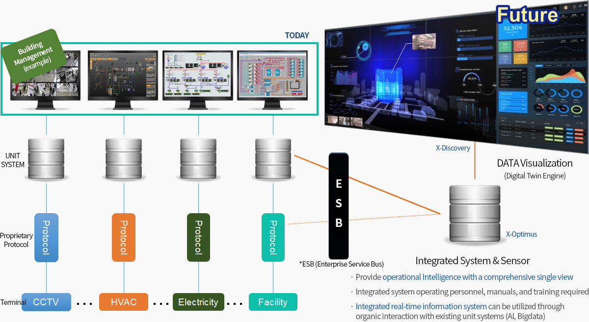 Unit systems consisting of each area, such as security, air conditioning, electricity, hot water, and elevators, need to be integrated into a single platform (Real-time information integration & Visualization)